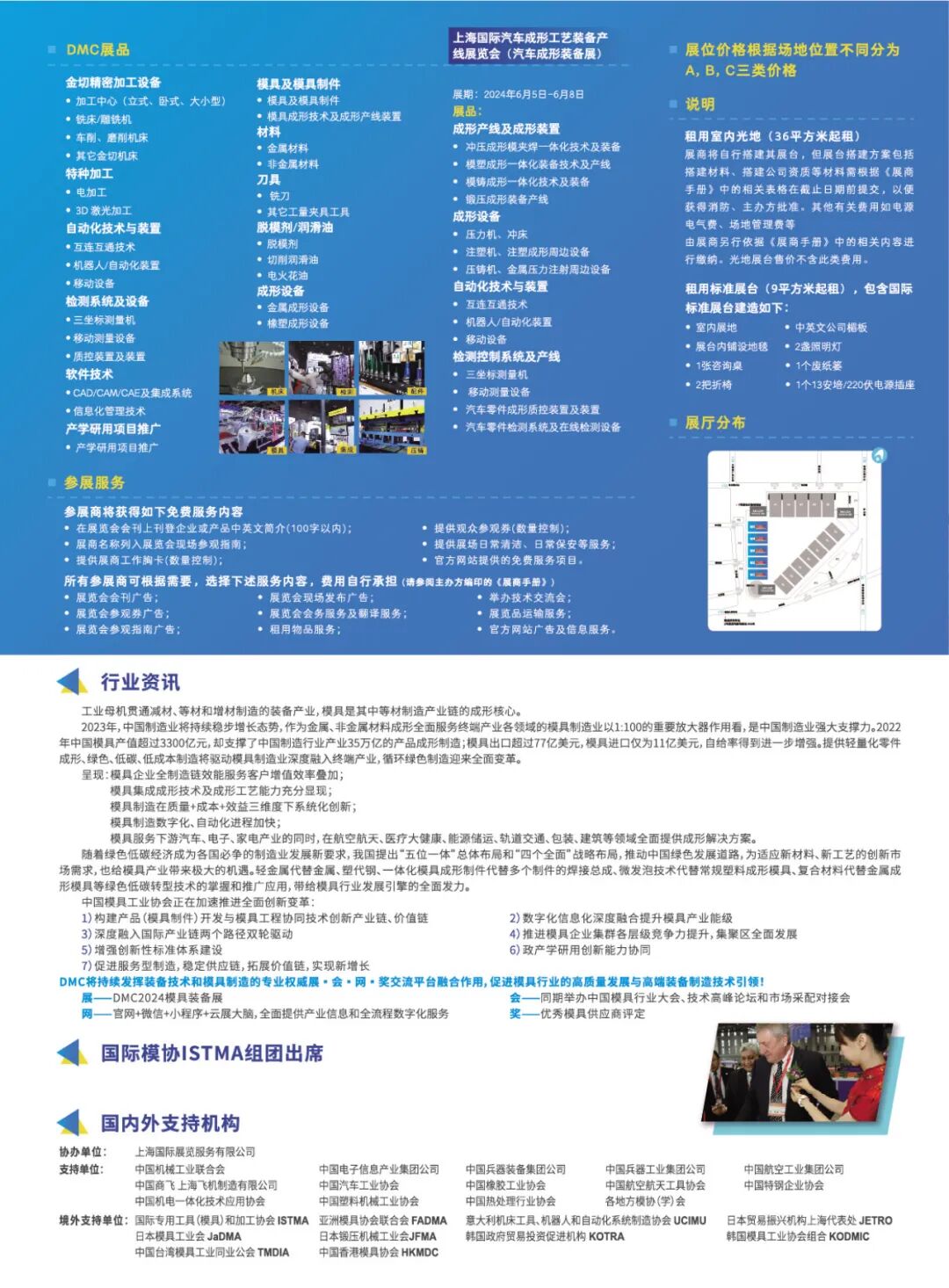 DMC2024将在在汽车模具原有板块基础上扩成形工艺装备与技术内容,全面展示中国汽车模具及汽车成形工艺装备的一体化制造水平。