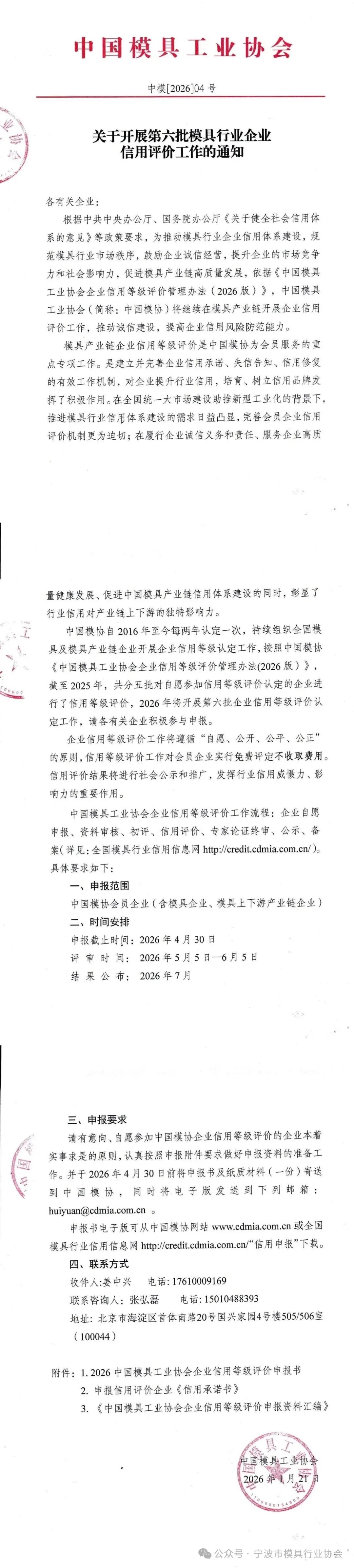 【申报通知】转发中国模协关于开展第六批模具产业链企业信用评价工作的通知
