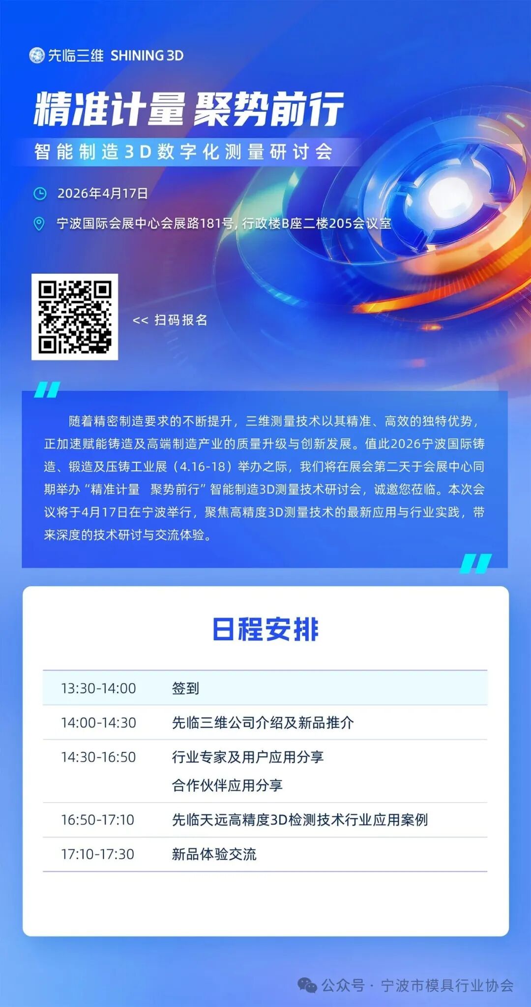诚邀您于4月17日莅临宁波国际会展中心,参加由先临三维主办的 “精准计量 聚势前行”——智能制造3D数字化测量研讨会,共探技术应用的前沿实践。