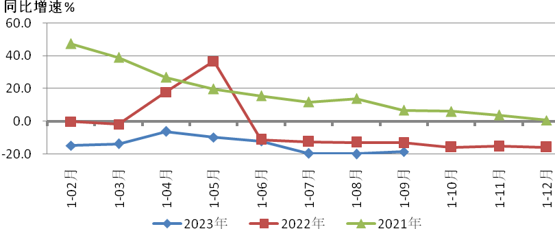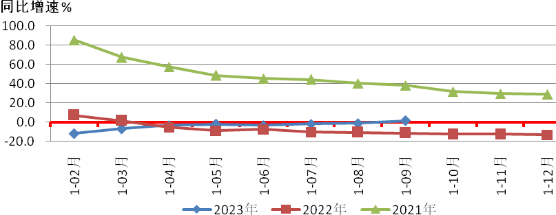 图1是2023年1-9月和2022年、2021年重点联系企业营业收入同比增速情况的对比。