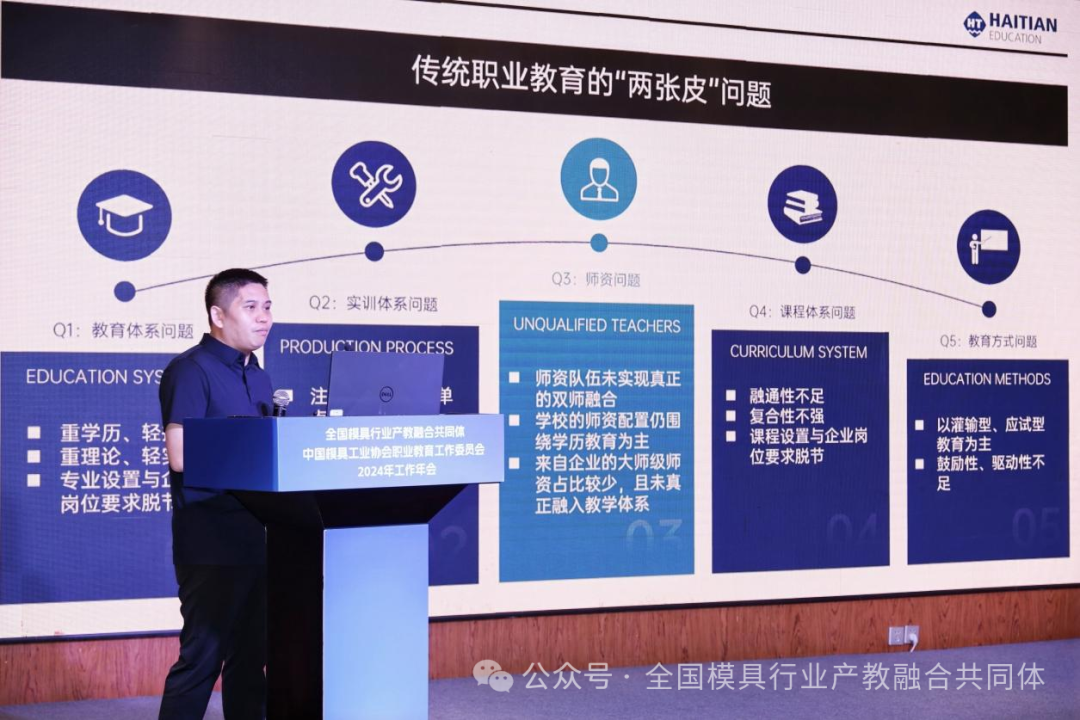 海天大学校长陈兴在会上作《突破传统职教壁垒,打通高技能人才培养最后一公里》主题报告。他介绍了海天集团的发展现状和产品线,并将企业的优质设备应用于产教融合发展,与高校合作开展双师型人才培养模式。