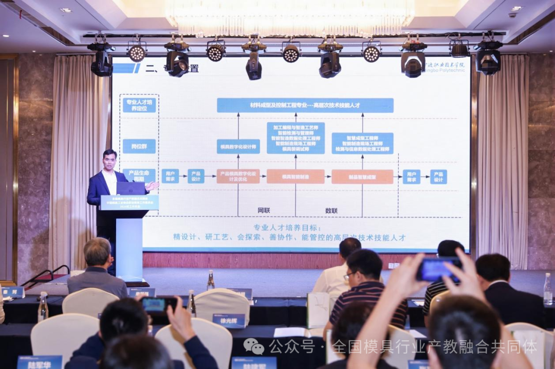 宁波职业技术学院阳明学院院长王正才在会上作《高水平模具设计与制造专业群的建设实践与探索》主题报告。他围绕模具产业背景阐述了高职院校如何进行专业设置,结合宁波职业技术学院阳明学院的发展历程,分享了产教融合的人才培养模式。