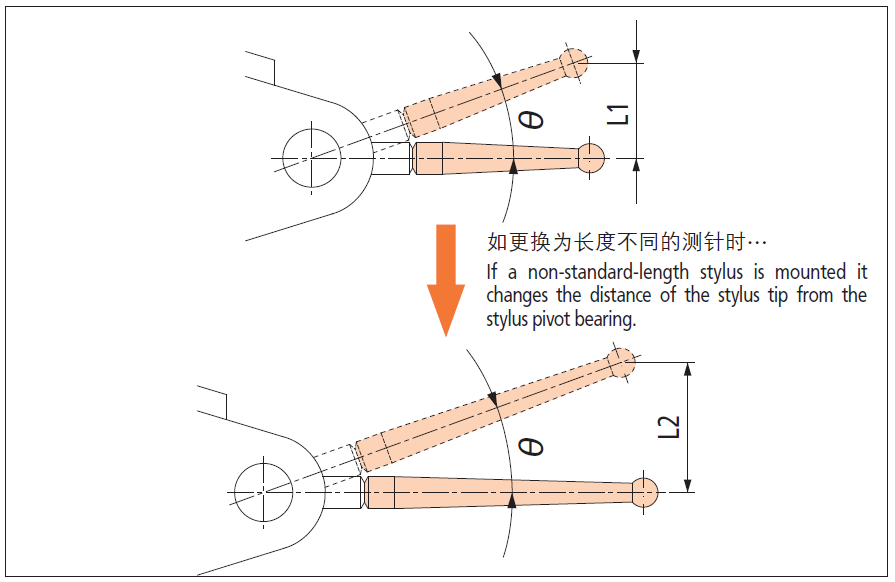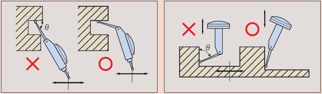 测头与测量面接触产生的角度会导致测量误差,安装时,请尽可能地将角度调到最小,不能水平使用时,每次产生的角度均要进行补偿。