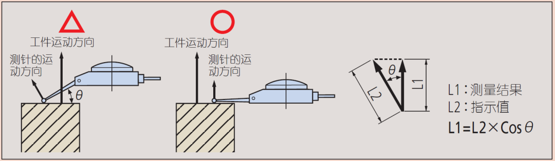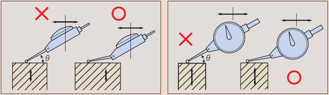 杠杆表会由于测针与测量面之间的角度而出现误差。将测针抵住测量面,尽量将下图的角度θ设置得小一些。测量值会因为θ的值而不同。按照图表根据θ值对测量值进行补偿。