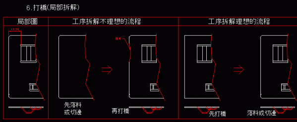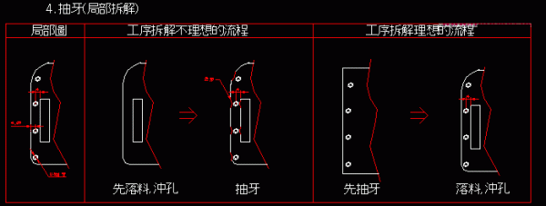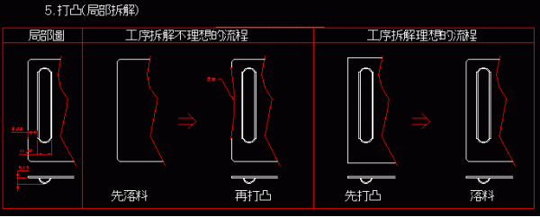 造成影响时,则当前的工序需要改进.在打凸時凸包时可能向下,打较大的凸包时要尽可能安排在第一工程冲压,并且打凸与打凸附近的冲孔不要排在一个工程內,以避免孔位拉料,产生变形.