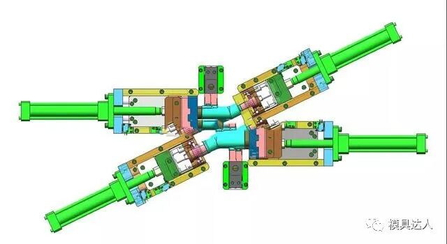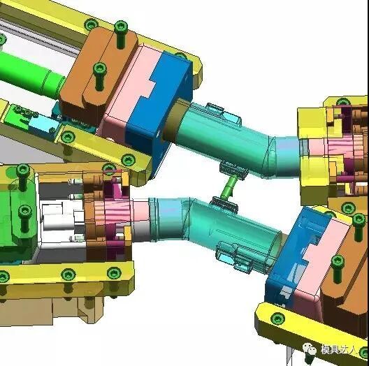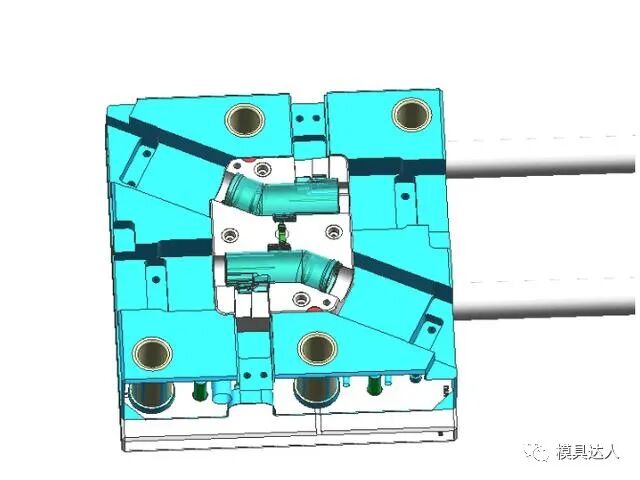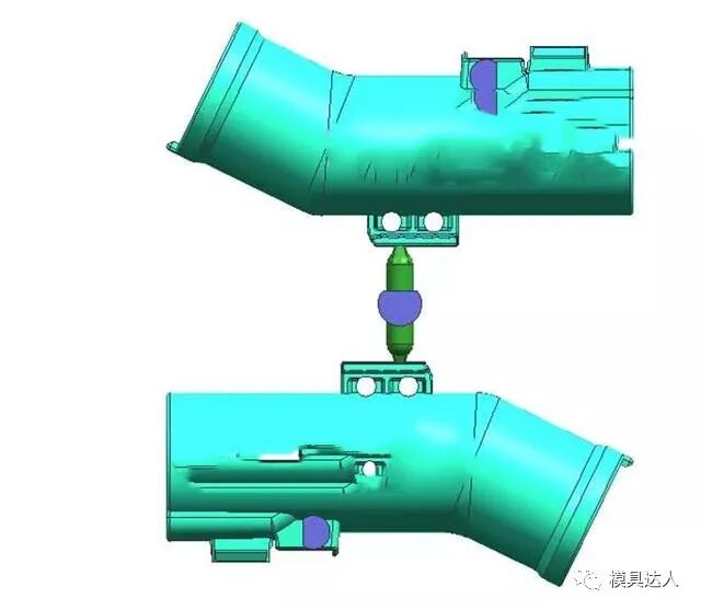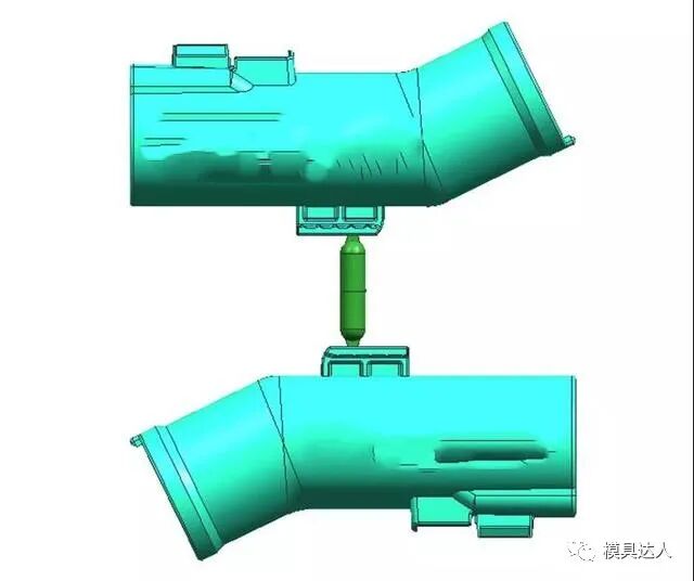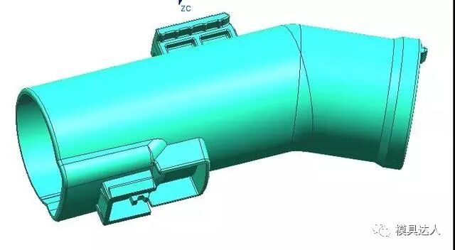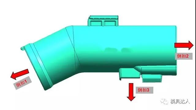 吸尘器弯管是吸尘器产品中经常遇到的,这类产品一般是采用油缸抽芯或者是圆弧抽芯,是汽车吸尘器模具中的典型代表。产品共有3处倒扣,倒扣1与倒扣2都采用油缸抽芯结构,倒扣3采用斜导柱+弹簧抽芯。