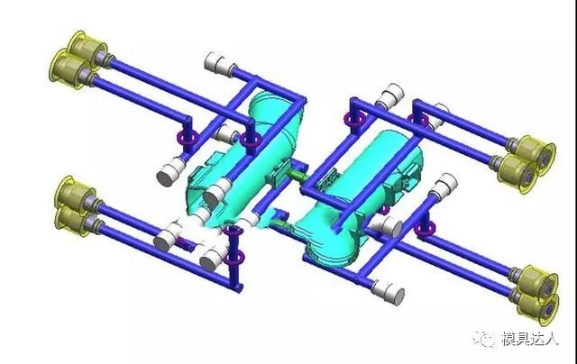 本模具浇注系统采用唧嘴,冷流道转侧进胶,1出2。