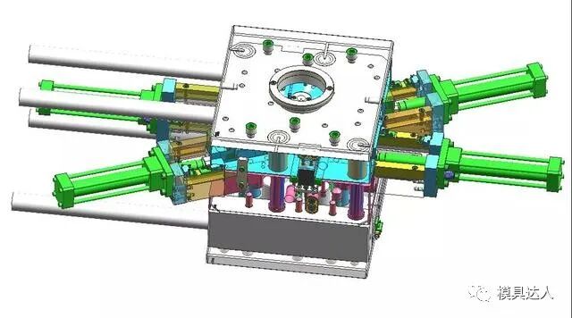 产品共有3处倒扣,倒扣1与倒扣2都采用油缸抽芯结构,倒扣3采用斜导柱+弹簧抽芯。