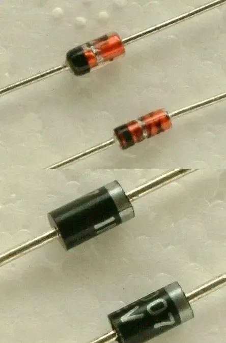 点接触型二极管是用一根很细的金属丝压在光洁的半导体晶片表面,通以脉冲电流,使触丝一端与晶片牢固地烧结在一起,形成一个“PN结”。由于是点接触,只允许通过较小的电流(不超过几十毫安),适用于高频小电流电路,如收音机的检波等。