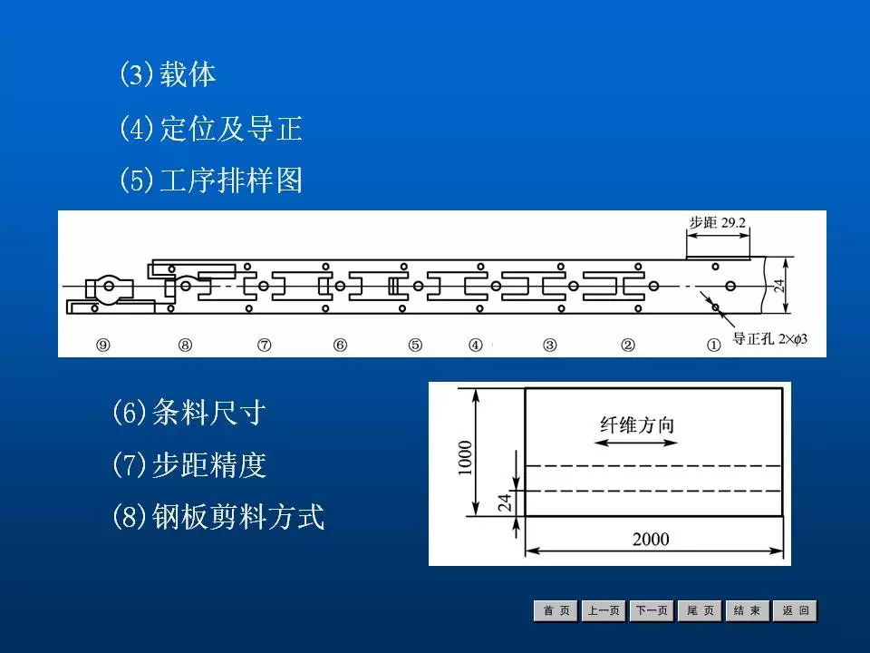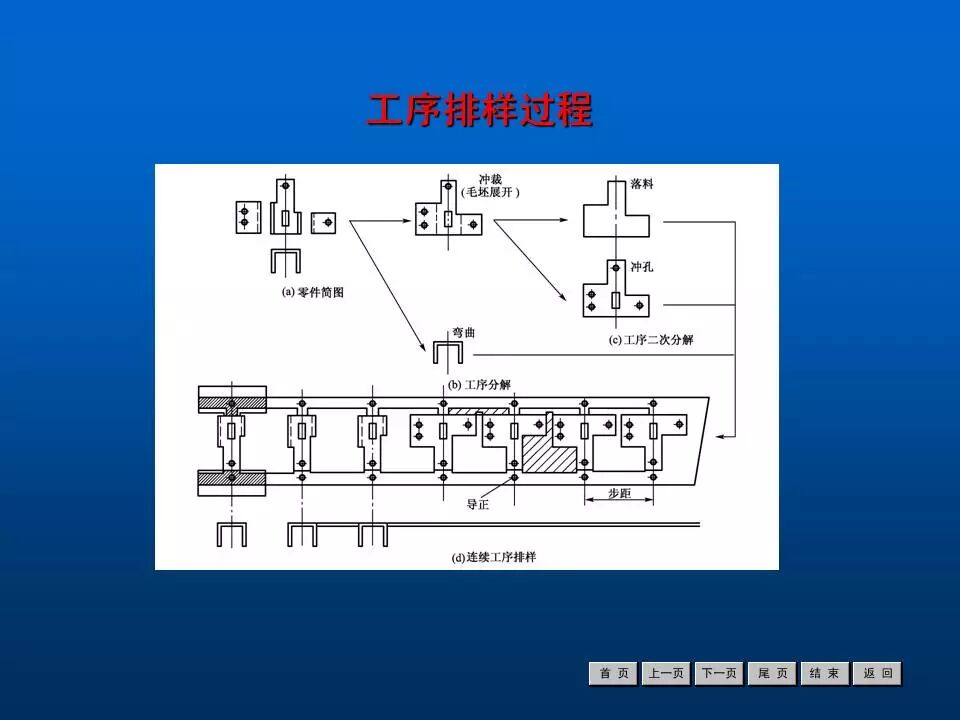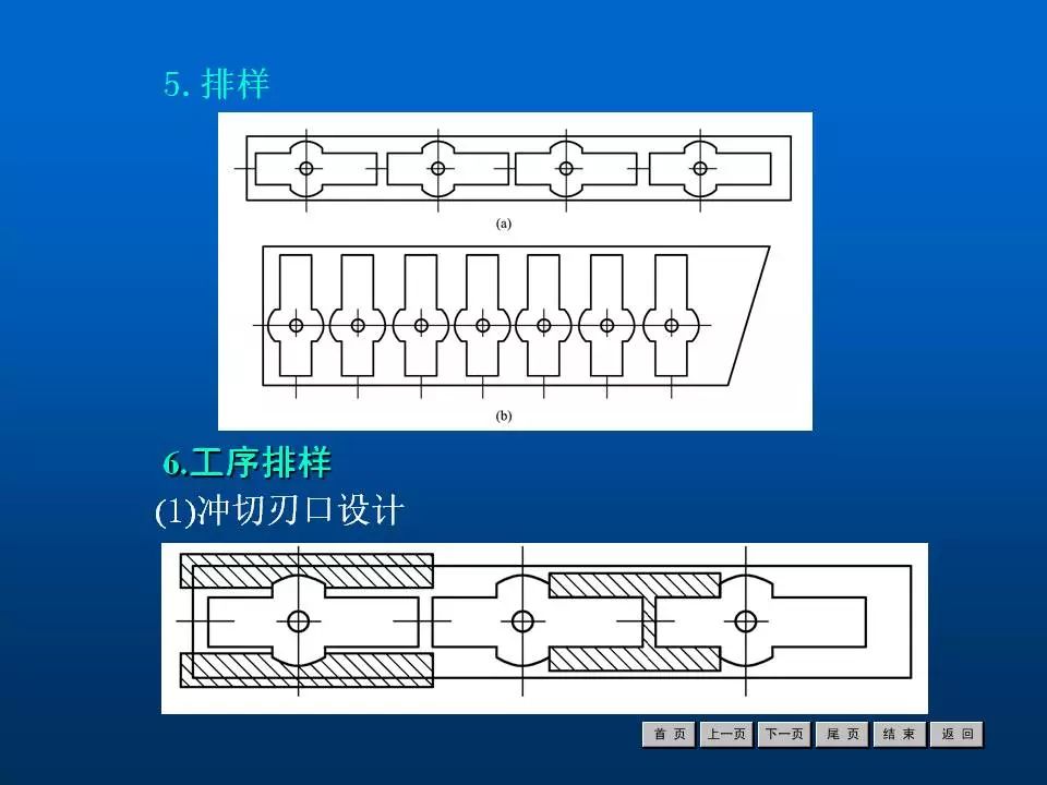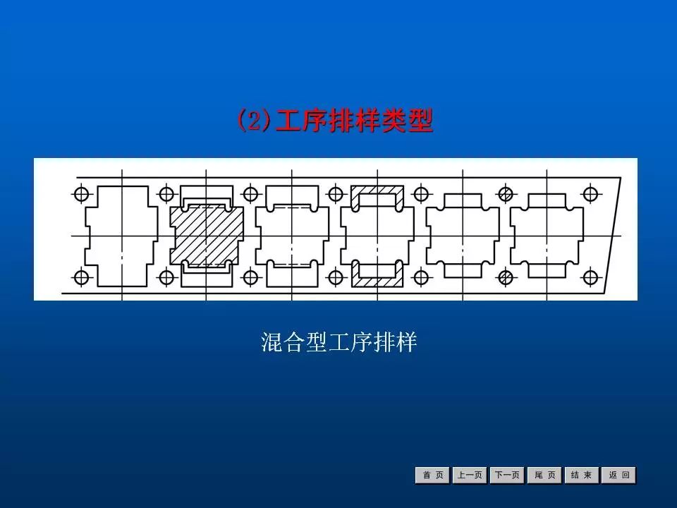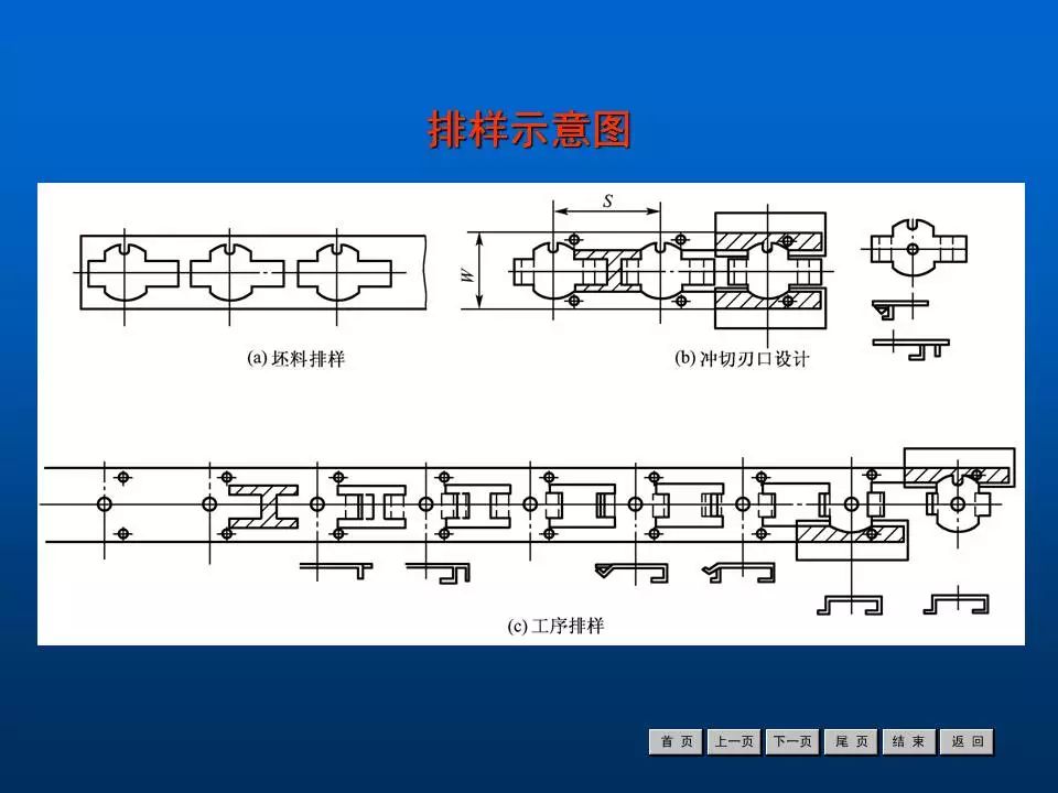 (1) 将冲头迭加图中的冲头及成形工序分布于模具中的适当位置,即为排样图。