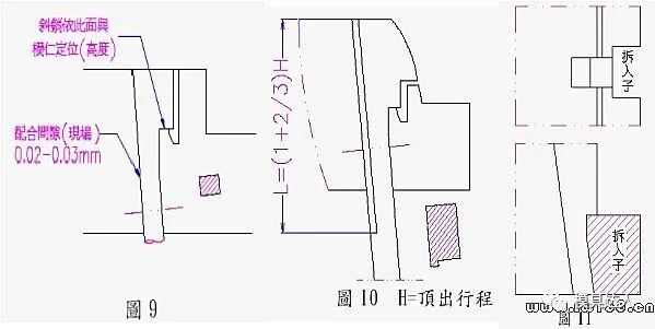 1.基本配合(如圖9)﹐公模仁線割斜孔。