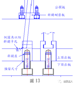 斜頂厚度太小時﹐作單面鉤﹔公模底部需加耐磨板﹔調整較困難﹐可在斜