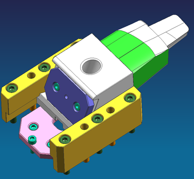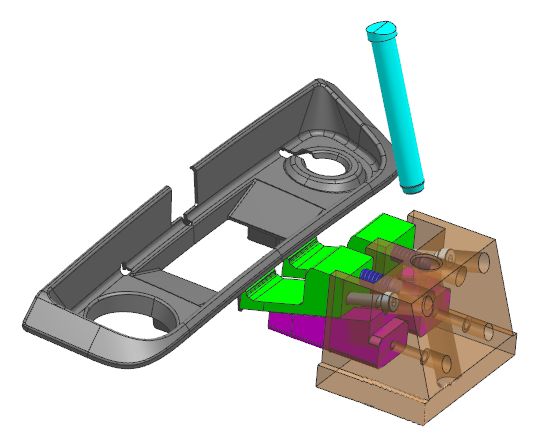 斜导柱驱动滑块向右侧抽芯,品红色的滑块镶件驱动斜顶向下运动,同时脱离倒扣,弹簧防止斜顶跟着滑块往右边走,走到一定距离以后限位螺丝限位,斜顶同时跟着滑块抽芯。