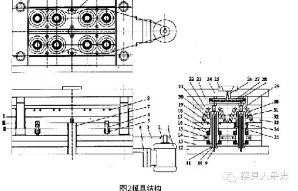 根据塑件分析及用户生产要求,模具设计为1模8腔,采用热流道针阀式点浇口进料,用减速电机通过链条传动完成自动脱螺纹,模具结构如图2所示。