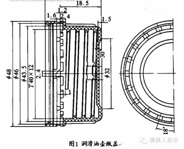 图1所示产品为润滑油壶瓶盖,材料为PP,产品特点是采用矩形螺纹,有防伪圈和止转槽设计,产品外观要求较高,且需求量大。另外,瓶盖是由自动灌装线机器旋盖,所以对产品尺寸及螺纹精度要求较高,强行脱螺纹模具结构无法达到产品使用要求,必须采用自动旋转脱螺纹模具结构。