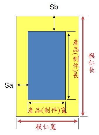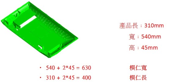 1. 一般而言,產品投影面積(包括模穴)決定後,投影寬度單邊加20mm ~50mm為模仁建議尺寸;得知模仁大小後,模仁寬度 + ( 0~10)後的寬度大約是模腳間距, 依此決定模座的大小。