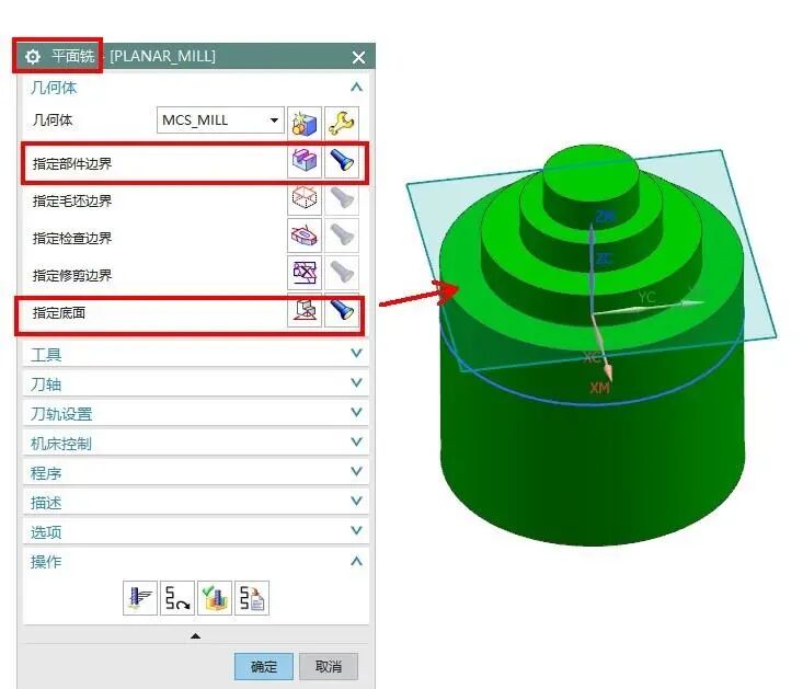 2、在【平面铣】工序界面,【指定部件边界】选择工件每个台阶面的边界,【指定底面】选择最下面的平面,如下图所示: