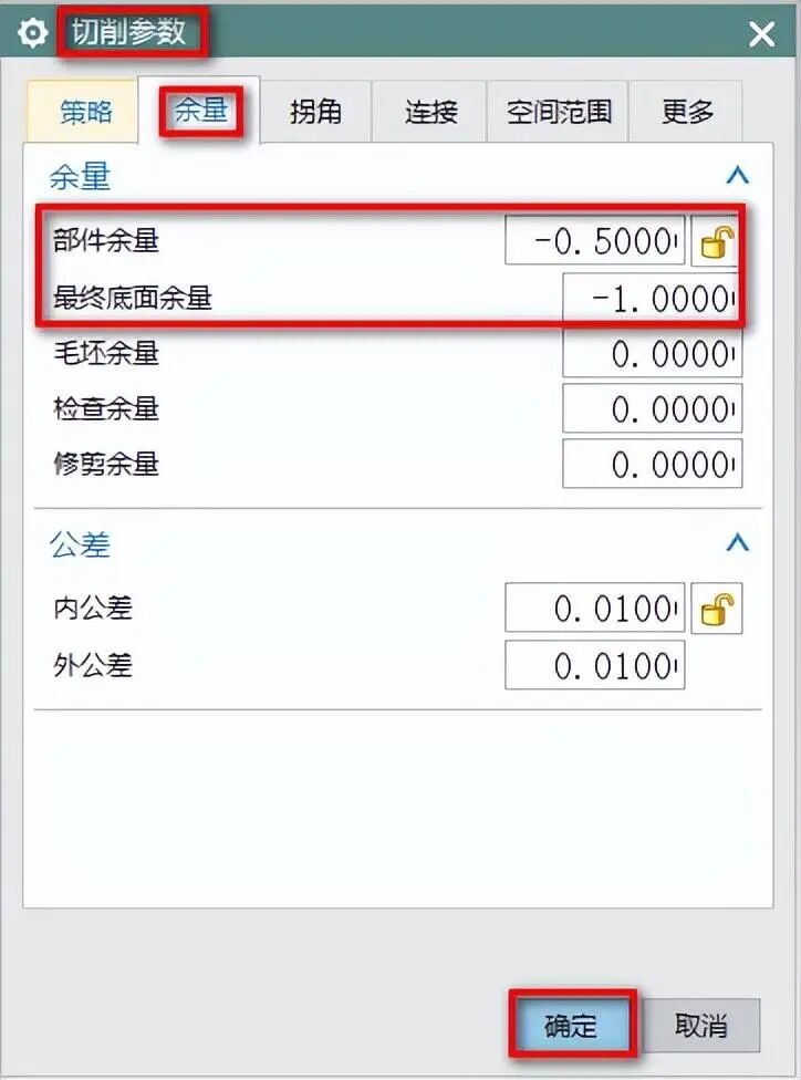 5、在打开【切削参数】界面,找到【余量】界面,这里准备倒C0.5的角,设置【部件余量-0.5MM】,倒C角的刀尖深度要超过C角大小才能加工干净,所以【最终底面余量-1MM】,如下图所示: