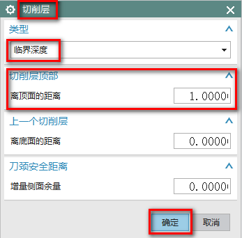 4、在【切削层】界面中,类型使用【临界深度】,因为是需要多台阶一起倒C角,刀尖要比每个平面位置深下去1MM,这样倒出来的C角才够完整,所以需要在【切削层顶部】设置【离顶面的距离1MM】,设置完成后点【确定】,如下图所示: