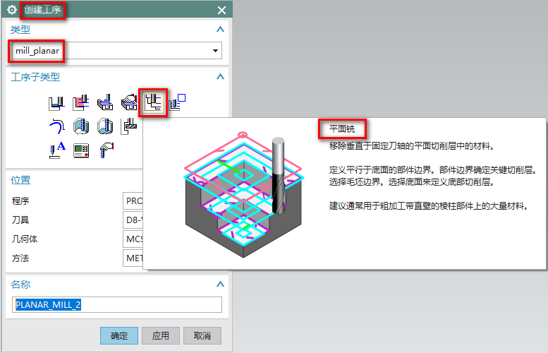 1、在加工界面中,【创建工序】-【mill-planar】-【平面铣】,如下图所示: