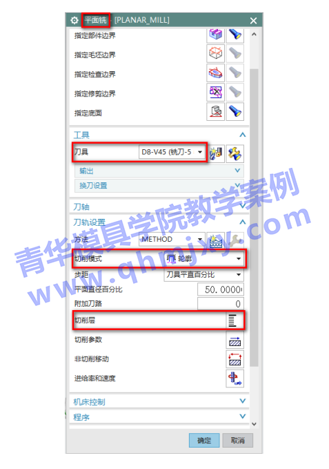3、在【平面铣】工序界面,【刀具】选择一把倒角刀,这里根据实际情况有的倒角选择了D8-V45的刀具,【切削模式-轮廓】,以上参数设置好后,点击【切削层】,如下图所示: